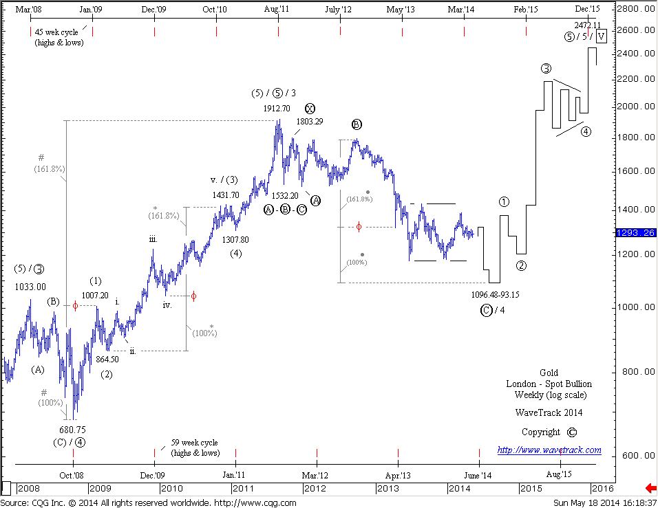 I presented WaveTrack International’s ‘INFLATION-POP’ theme where gold first declines towards US$1096.00+/- into July/August, max. September this year (2014), but then changes direction to begin another surge into record highs. Rather than shocking the delegates, especially since most seemed apathetic beforehand when asked about their own expectations, a resounding interest in the possibility began to emerge – I interpreted this as a positive reaction!